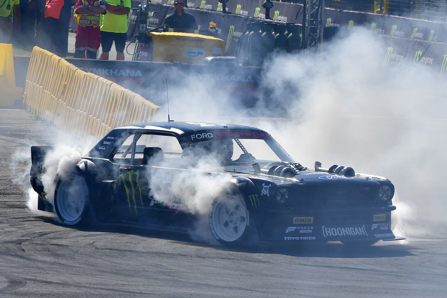 With a special class set aside to promote sheer spectacle, American YouTube maestro Ken Block got the nod from the crowd with his twin turbocharged, eight-litre Ford Mustang Hoonicorn V2, which blasted around the course, smoking all four wheels and spitting flames.